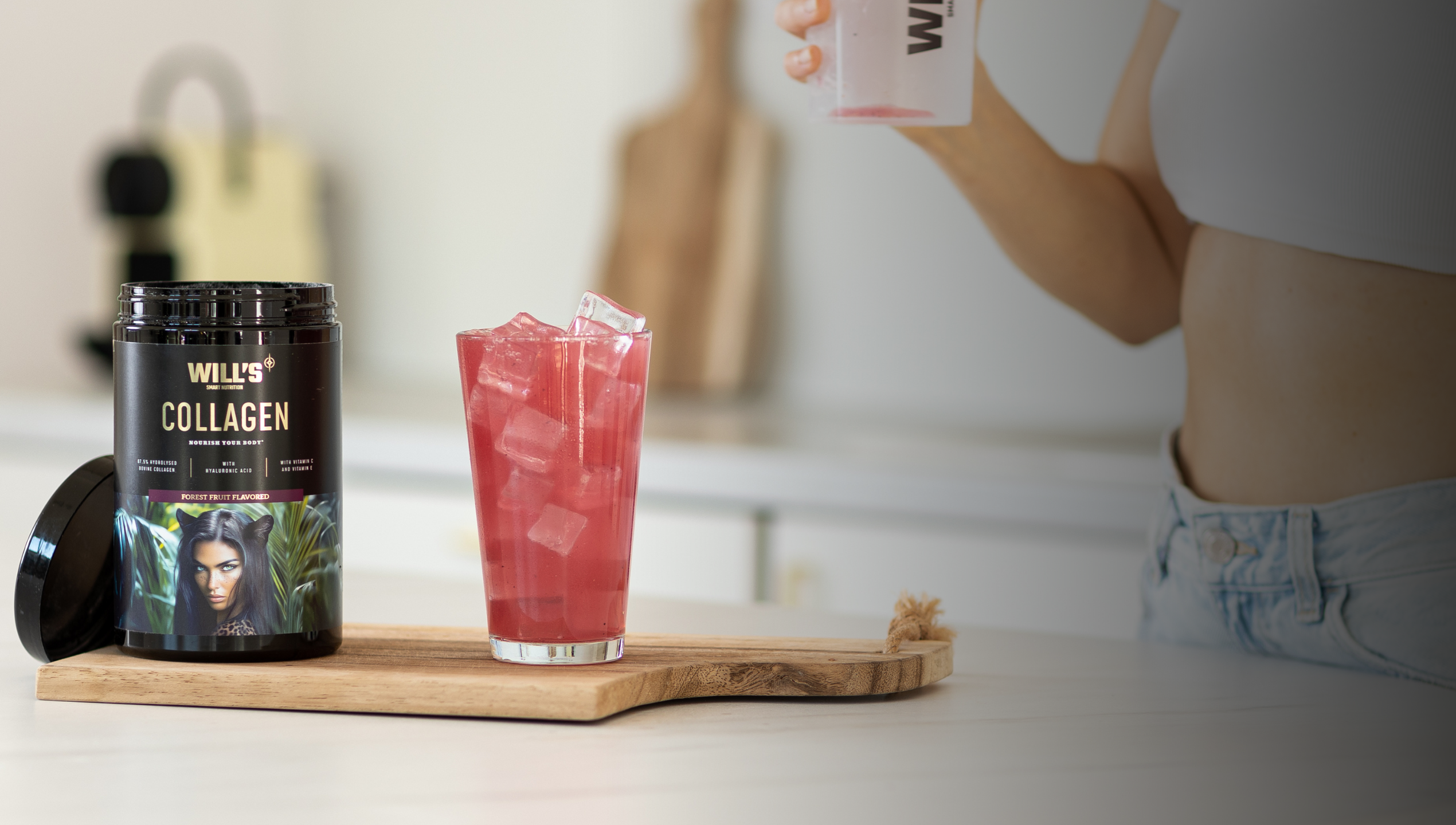Hidrolizált kollagéntartalmú étrendkiegészítő italpor hialuronsavval, C- és E-vitaminnal, édesítőszerrel.